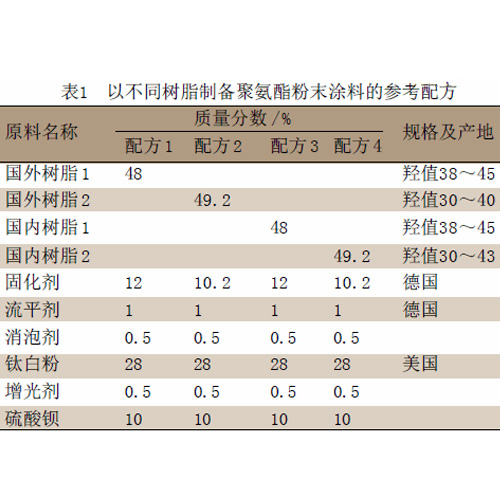 選取的飽和羥基聚酯有國外樹脂1、國外樹脂2 和國內(nèi)樹脂1、國內(nèi)樹脂2,作對比試驗。其參考配方見表1。