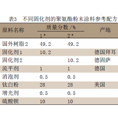 聚氨酯粉末涂料的固化劑現(xiàn)在主要還是采用進口的,在此選擇了德國拜耳的2147不封閉型的異氰酸酯為固化劑1和德固薩的b-1530封閉型的異氰酸酯為固化劑2作為實驗用的固化劑,樹脂選用上述試驗的國外樹脂2,其參考配方見表3。